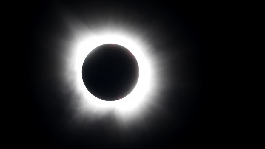 La corona solar, la capa exterior de la atmósfera del Sol, se hace especialmente visible durante un eclipse. Se observará con atención: aquí es donde se producen las erupciones solares.
